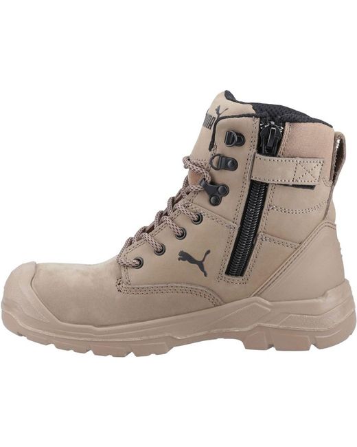 Introducing the Puma Safety Conquest High Safety Boot--your ultimate companion for tough work environments where safety and comfort are paramount. Crafted from premium oiled full leather, these boots offer superior durability and a rugged appearance, perfect for demanding conditions. The extra-high shaft ensures enhanced ankle support and protection. Designed for convenience, the boot features a lateral YKK zipper with a closed dust tongue, making it easy to slip in and out while keeping debris at bay. The TPU heel support and KickOff feature in the heel area provide exceptional stability and comfort, reducing fatigue during long hours on your feet. The Conquest High Safety Boot is equipped with a PU rubber sole engineered to withstand temperatures up to 300�C, ensuring reliable .