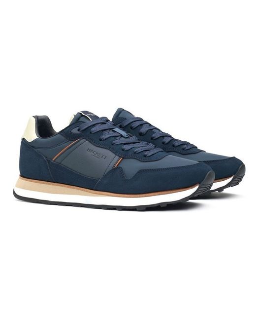 Take your style to a new level, in the Hackett London Telfor Shadow trainers. Crafted from rich blue leather and suede, with tan accents, and a sleek, padded leather collar, these kicks are made for the urban explorer. The branding on the sides adds signature Hackett flair, while the two-tone rubber sole, an eye-catching heel detail and the removable insole provide cushioned comfort and style mile after mile.