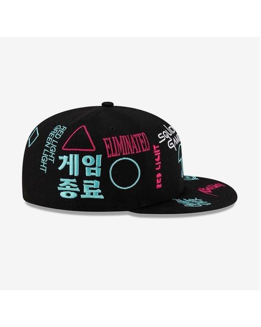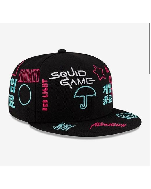 Squid Game Scribble Netflix Black 59FIFTY Fitted Cap Netflix Squid Game related wordmarks and graphics around crown and visor top New Era Flag embroidered on left Structured crown Fitted Flat visor Black undervisor 100% POLYESTER