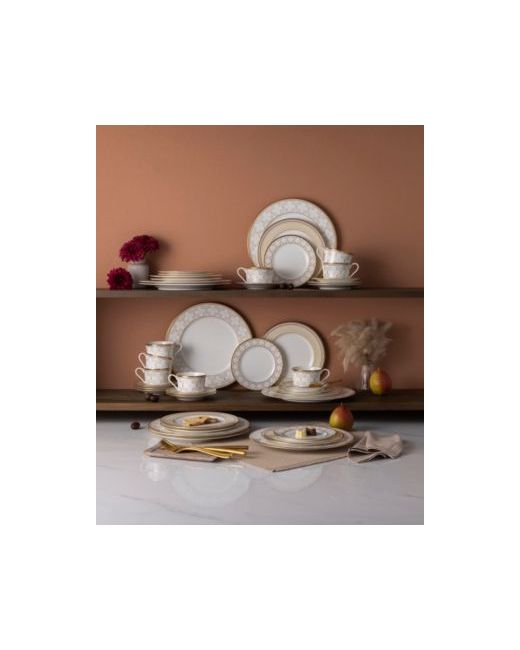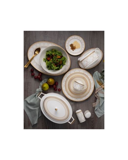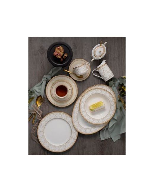 Trefolio gold features a repeating, stylish four-leaf-clover design, presented in multiple sizes on different pieces for maximum impact. The larger presentation is punctuated with raised enamel dots. The soft coloration of white and cream, paired with gold, makes this pattern accessible and appropriate to pair with any style of decor.