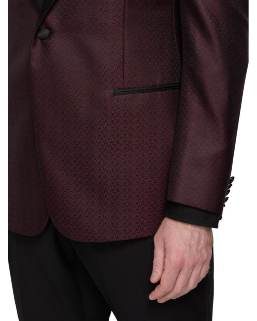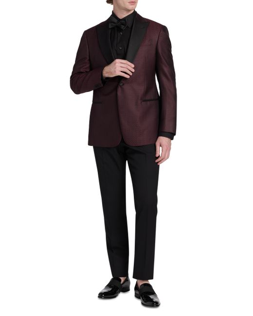 Crafted of a printed virgin wool-silk blend, this Giorgio Armani dinner jacket features a classic tailored design with contrasting solid peak lapels and welt pockets. Peak lapels Long sleeves, button cuffs Chest and side welt pockets Single-button closure 74% virgin wool/26% silk Combo: 59% polyester/41% silk Lining: 100% viscose Dry clean Made in Italy SIZE & FIT Model measurements: 6'12" tall, 40" chest, 31" waist Model is wearing a US size 40R. Men Luxury Coll - Giorgio Armani C > Giorgio Armani > Saks Fifth Avenue > Barneys. Giorgio Armani. Color: Dark Red. Size: 38.