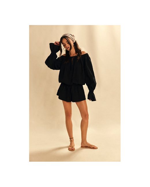 For effortless moments, slip into this seersucker romper from free-est, featuring a wide boat neckline with puffed long sleeves and a blousey bodice. **Fit:** Relaxed, step-in style **Features:** Seersucker fabrication, wide boat neckline with tie detail, balloon sleeves, flared cuffs, relaxed shorts, adjustable drawcord waistline **Why We ❤ It:** A necessity on your packing list, perfect for endless occasions from beachfront to sunset dinner. Estrella Romper by free-est at Free People in Black, Size: XS