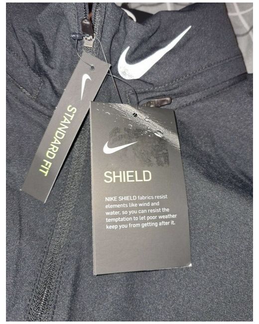 Nike Shield Women's Running Jacket Full Zip Hoodie Black CZ3893 010 - SMALL. 1 good size front zip pocket 2 generous front concealed pockets Packable hood Full zip Logo on high collar Concealed mesh back panel to allow ventilation Longer back