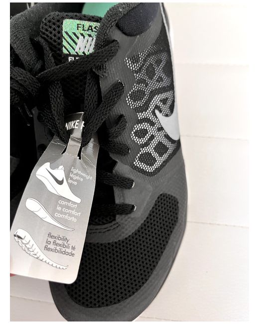 Black with white detail, glittery greenish design on tongue, silverish large tick logo and green insoles.