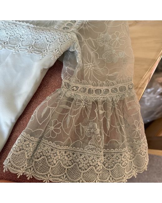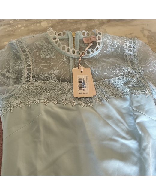 This dress is a light blue Ted Baker dress with design on the neck and sleeves. It can be worn during any season really. The dress is a Size 1 and a medium length. It is completely new as the main reason it is being sold is due to it not fitting and the shop having a no return policy.