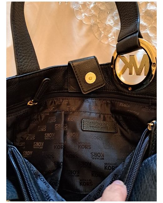 This medium-sized black leather Michael Kors bag is a stylish sling bag designed for women. It features the signature Michael Kors logo, a black fabric lining, and both black leather handles/straps and exterior material. The sleek design and high-quality materials make it a versatile and chic accessory for any outfit. Perfect for carrying your essentials with ease and sophistication.