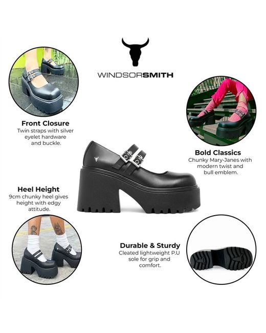 Women's Black Windsorsmith Leather Chunky Platform Mary-Jane Heel Shoes Lessons