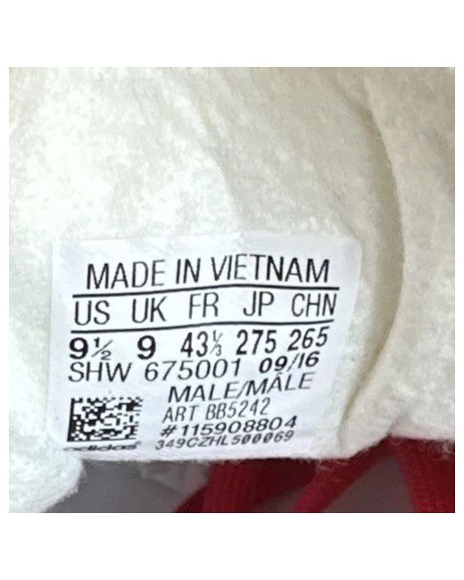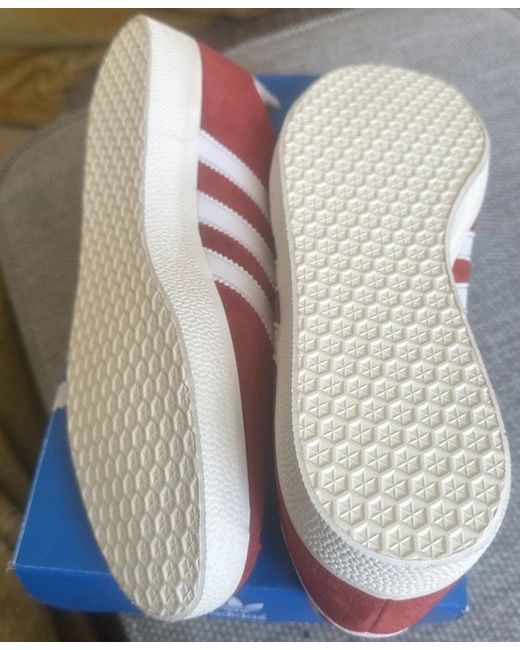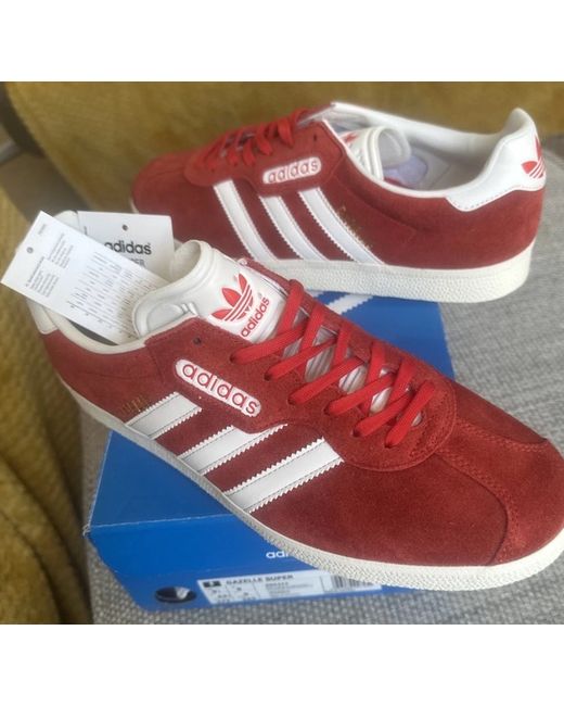 This product is a pair of men's Adidas Super 2016 trainers in UK size 9. The shoes feature a low top style with a lace-up closure and a red colourway. Made with suede upper material and a foam insole for comfort, these sneakers have a standard shoe width and a rubber outsole for durability. The vintage design adds a classic touch to this Adidas release from 2016. Made in Vietnam, these trainers are part of the adidas Gazelle product line.