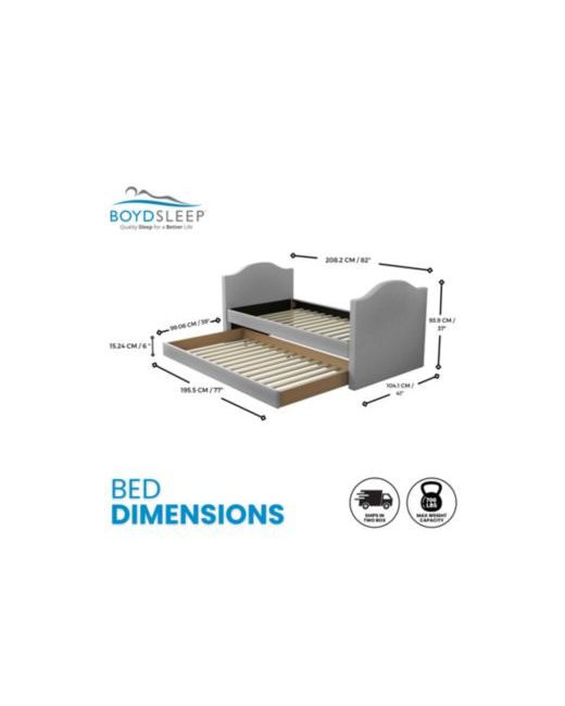 This daybed is fully upholstered and slightly padded to give it a premium look and feel. Its sofa back is tufted, hugged by sloping track arms with nailhead trim, providing a modern and elegant design. The trundle drawer of the daybed rolls out with ease, and when closed, it gives the appearance of a real sofa, with no visibility to the mattress and bedding inside.The trundle and bed area have supportive wood slats, providing a comfortable sleeping surface. Constructed of durable Mdf, the frame of this cute and functional daybed provides a reliable structure. You can use twin mattresses of your choice, and the trundle can hold a mattress up to 8 inches, giving you the flexibility to choose a deeper mattress on top, depending on your preference. The daybed ships in two boxes and comes complete with all the necessary hardware and instructions to assemble it quickly and easily.