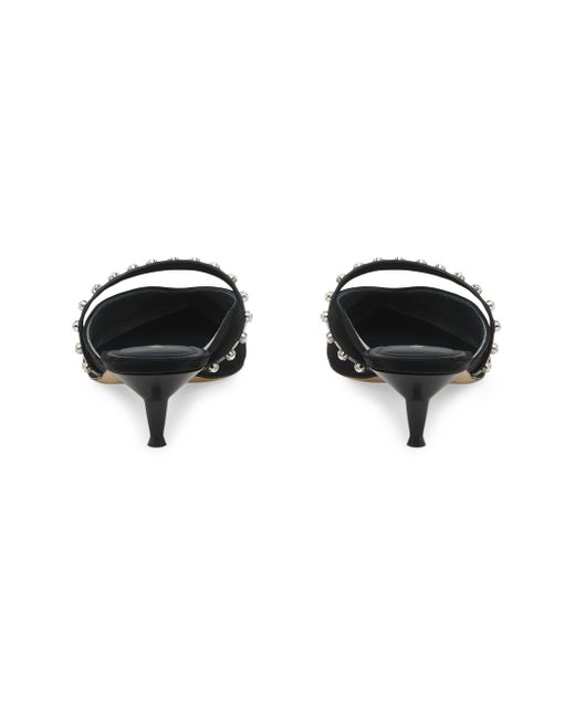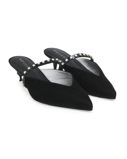 Crafted of Italian leather, McQueen's timeless kitten-heel mules are elevated with a vamp strap adorned with crystal embellishments. Point toe Slides on Leather upper Leather lining Rubber sole Made in Italy SIZE Heel, about 1.5" (40mm) ABOUT THE BRAND Visionary designer Lee Alexander McQueen launched his brand in 1992, which quickly became synonymous with cutting-edge, avant-garde design. Creative Director Seán McGirr has continued the designer's legacy, bringing precision craftsmanship and a feminine vision to the label's signature edge. Women's Shoes - Alexander Mcqueen Shoes > Mcqueen > Saks Fifth Avenue > Barneys. McQueen. Color: Black Silver. Size: 6.