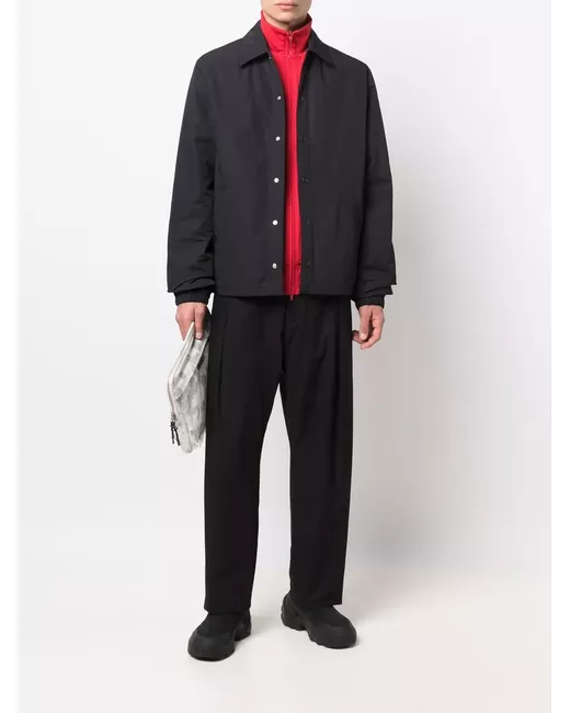 black pointed flat collar front button fastening long sleeves two front welt pockets