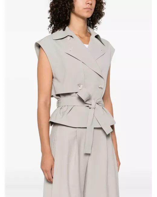 grey double-breasted belted waist sleeveless notched lapel button closure