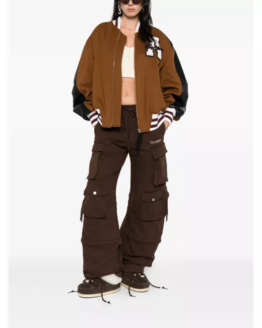 camel brown leather sleeves varsity-style ribbed trims appliqué letter detail zip front fastening welt pockets
