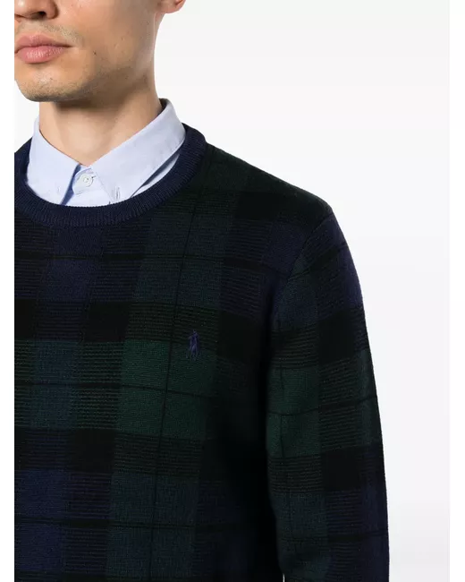 navy blue/forest green wool plaid check pattern knitted construction signature Polo Pony motif embroidered logo at the chest crew neck long sleeves ribbed cuffs and hem