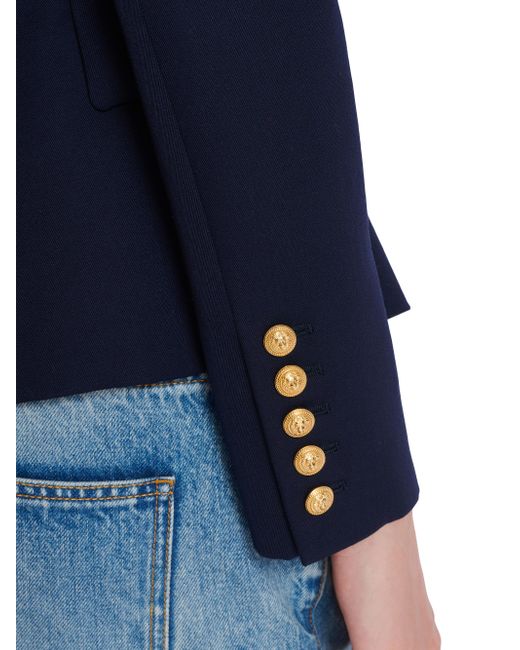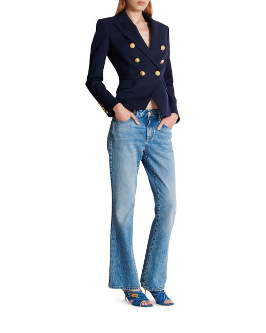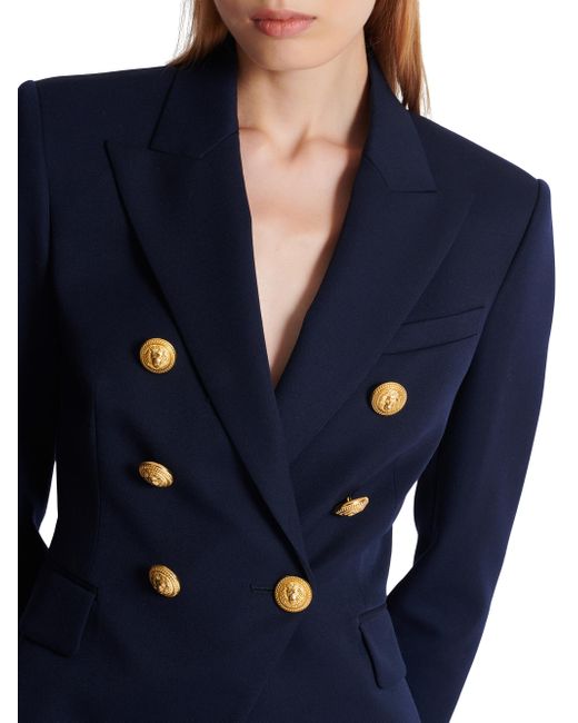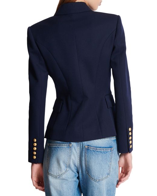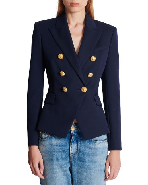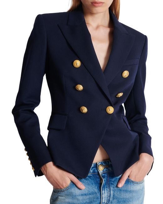 Crafted of wool, this Balmain double-breasted jacket is designed with peak lapels and goldtone buttons. Peak lapels Long sleeves, button cuffs Chest welt pocket Side flap pockets Double-breasted button closure 100% wool Dry clean Made in Portugal SIZE & FIT Model measurements: 5'10" tall Model is wearing a US size 4 ABOUT THE BRAND In 1945, founder Pierre Balmain made his well-received debut of opulent, ultra-feminine designs. Known today for its iconic blazers, impeccably constructed dresses and signature fragrances, the brand continues its dedication to masterful tailoring and elegance under the helm of Creative Director Olivier Rousteing. Advanced Designer - Balmain > Balmain > Saks Fifth Avenue > Barneys. Balmain. Color: Marine. Size: 2.