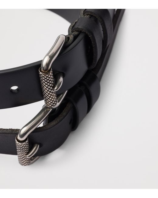 Sleek and sophisticated, this leather belt by Prada blends minimalist lines with modern flair. Its subtle profile is elevated by a duo of distinctive buckles, which will add a bold yet refined touch to both casual and polished looks.