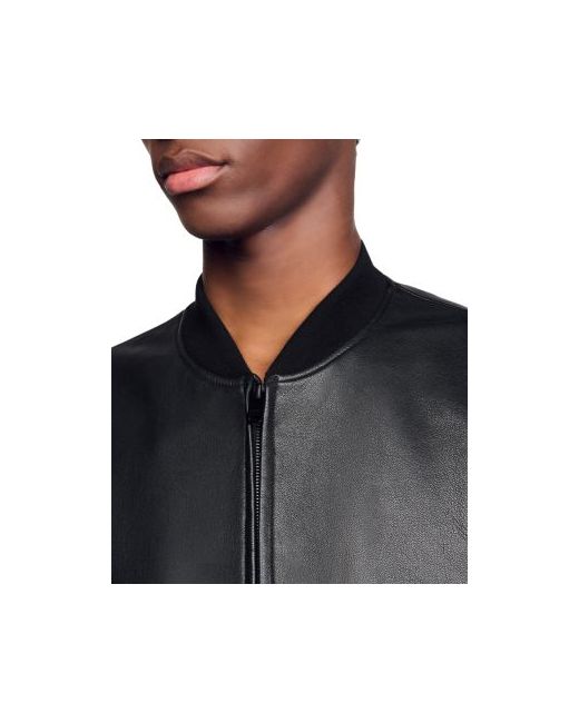 Sandro Leather Jacket.Color:Black.Size:L.Material:Shell: leather; rib trim: 53% cotton/45% polyester/2% elastane; pocket lining: 100% cotton; lining: 100% polyester.Jackets.