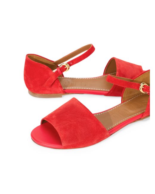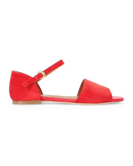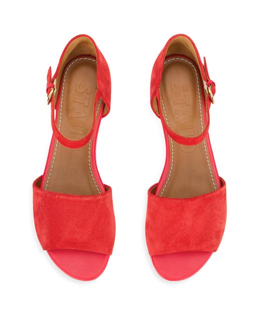 Staud's Catherine flat sandals feature a buckle closure and are crafted of striking suede. Open toe Buckle closure Leather upper Leather/ABS sole Made in Portugal. Women's Shoes - Workshop Shoes > Staud > Saks Fifth Avenue > Barneys. Staud. Color: Red Rose. Size: 5.