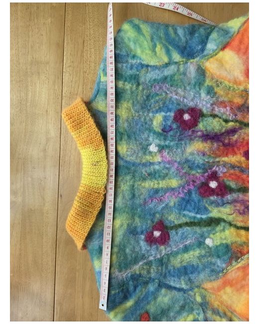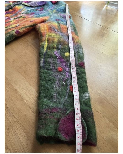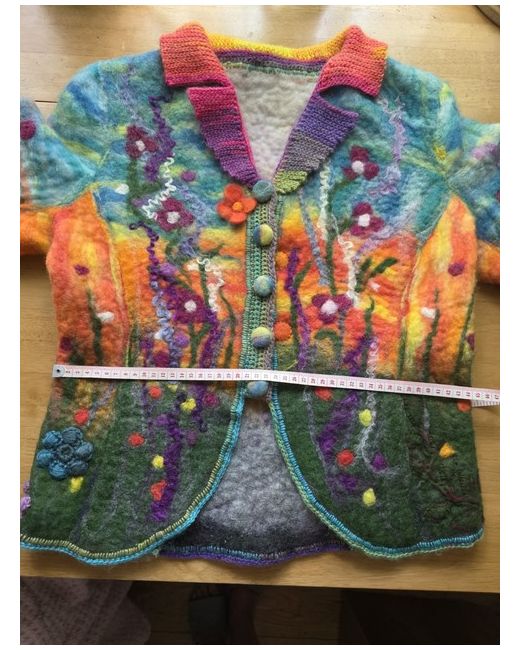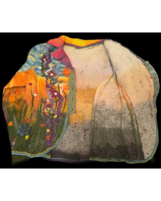 This handmade felted wool women's jacket in size M features a multicoloured design with button accents, perfect for casual occasions in autumn. The jacket is crafted from wool, providing both warmth and style, making it a basic yet versatile garment for everyday wear. With its unique handmade quality and eye-catching multicoloured design, this jacket is sure to stand out from other coats and jackets in your wardrobe. Perfect for adding a touch of artistic flair to your seasonal look.