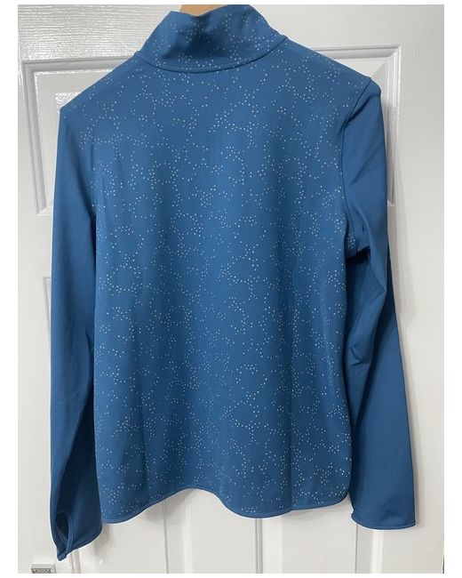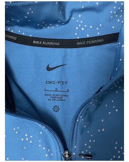 This Nike Women's Swift Element 1/4 Zip Running Top in blue is designed for activewear, specifically for running and jogging. The top features a mock neck with a 1/4 zip closure, long sleeves, and is made of light wash polyester material. It is a size L and part of the Nike Dri-Fit product line, offering comfort and performance during athletic activities. Perfect for autumn, winter, summer, or spring seasons, this top combines style and functionality for women who enjoy staying active.