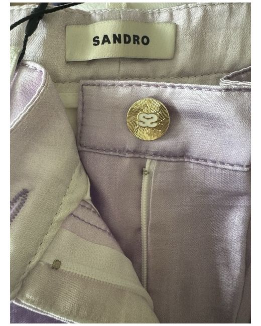 DESIGNER BRANDS: Excellent, mint condition, brand new, never been worn, in original packaging with tags, tissue, box and card. A gorgeous pair of women’s designer Sandro trousers. Zip and gold button fastening. Half white / half purple. Size 40 (UK12) Original price was 227 online, possibly even more. **Dressy trousers that would be perfect for any occasion. One of a kind!** Online description as below: SANDRO. wide-leg trousers, satin, two-tone, brand logo, high waisted, regular fit, zip fastening, 1 button, multipockets, dry clean, do not bleach, do not tumble dry. 52% Viscose, 48% Linen.