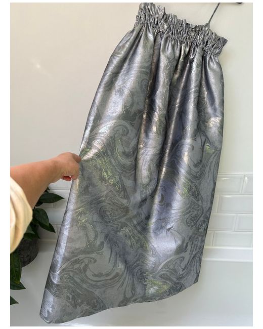 Size - DK38 UK12. There is a loop inside the back and the strap has a knot on the end. You can undo and alter where the knot sits to adjust the height of the strap. A perfect evening or event dress.