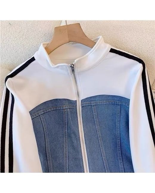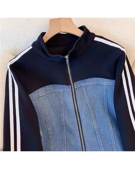 Contrast Denim Sets Stand Collar Zipper Jackets Coats 2 Piece Set Fit