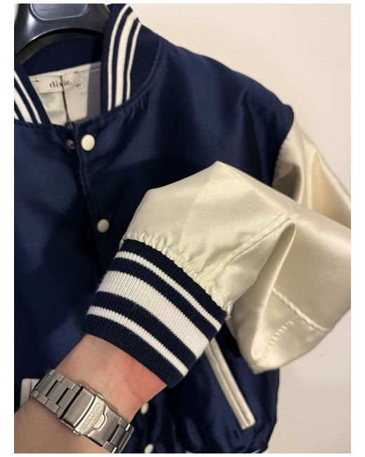 This Dixie bomber jacket in size S is a stylish choice for women. The jacket features a classic varsity style in blue and white, with button closure and elastic waist. Made of 100% polyester, it is lightweight, quick-drying, and wind-resistant, perfect for autumn, summer, and spring. The jacket has a collared neckline, long sleeves, and a mid-length fit. With a regular fit and breathable lining, it's a versatile piece for travel, parties, or casual wear. New + Tags