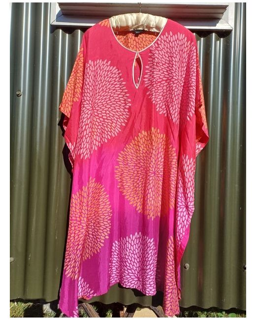 One off exclusive designer caftan perfect for holiday. Amazing hand printed. French seamed, hand silver binding around neckline. Lightweight airy wear perfect for any heatwave or wear in the evening Belted. Stunning exotic colours. Incredible opportunity to own an individual piece from Jaipur designer.
