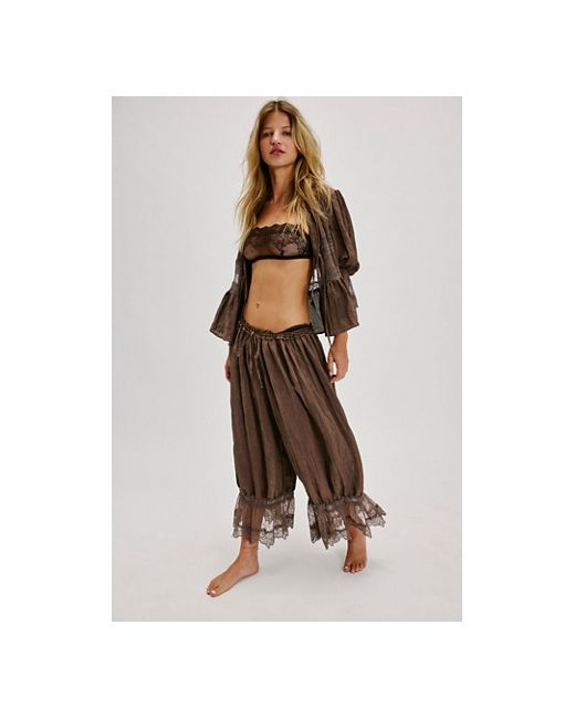 An elevated take on the classic bloomers, these pants feature a soft fabrication and mid-rise fit with feminine lace trim and functional tie-front detailing. **Fit:** Mid-rise fit, cropped legs **Features:** Soft fabrication with a lightweight feel, smocked elasticated waistband with functional tie, gathered legs with tapered hem, sheer lace trim **Why We ❤ It:** Essential for lounging around but also perfect for heading out, these bloomer-inspired bottoms were designed to do it all. Forever Young Bloomer Pants by Intimately at Free People in Deep Taupe, Size: XS
