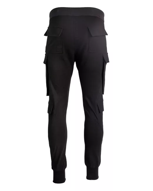 black multiple cargo pockets drawstring waistband cuffed hems flat front