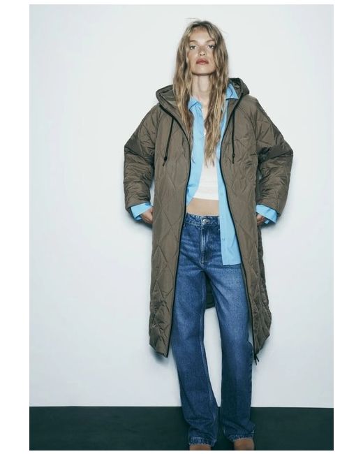 Zara Long Puffer Jacket Khaki Size S 3046/229