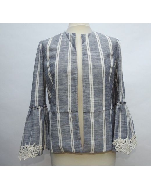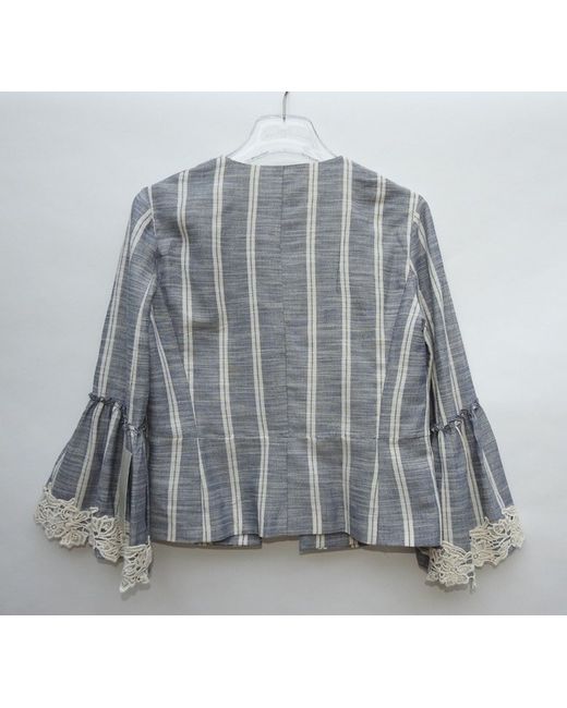 Round neck jacket featuring long sleeves with flared cuffs and contrasting lace trims and a. SHOULDERS 14.5" ARMPIT TO ARMPIT 18.5" SLEEVES 19" LENGTH 21".