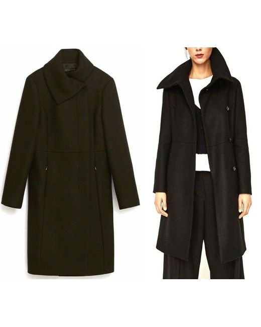 100% AUTHENTIC ZARA WOMAN PRODUCT REF: 2055/744. BLACK MAXI-COLLAR " DOUBLE BREASTED WOOL BLEND COAT. slightly flared bottom with a fold detail at the back Composition outer shell - 75% wool, 25% polyamide.