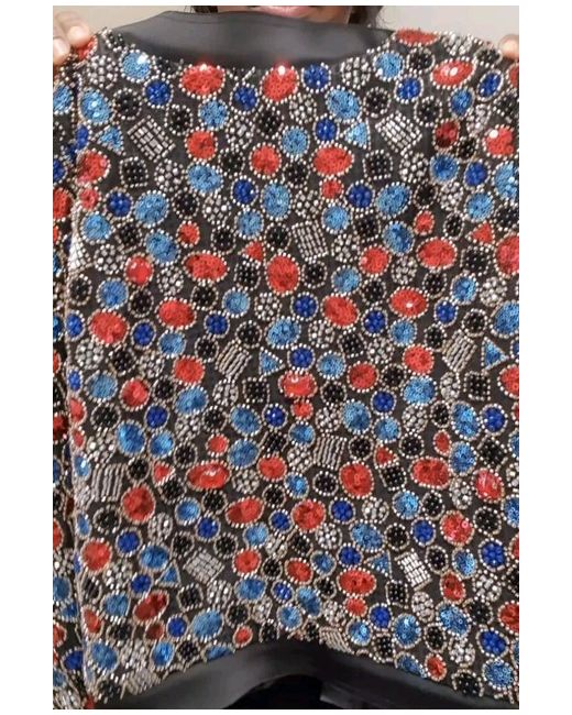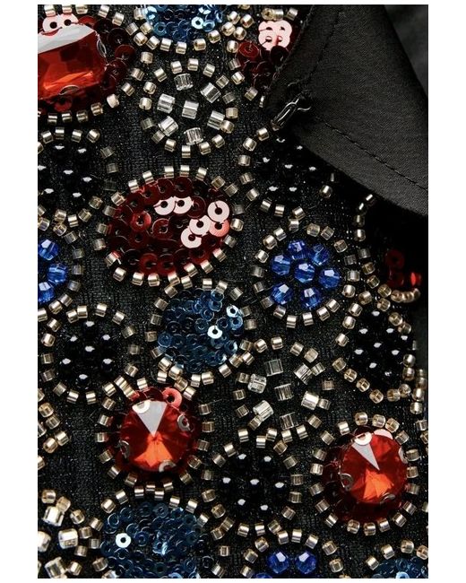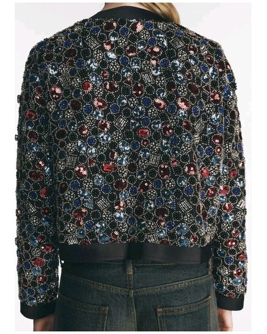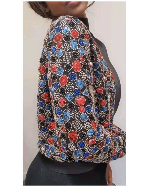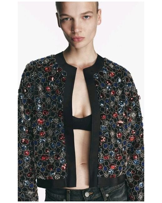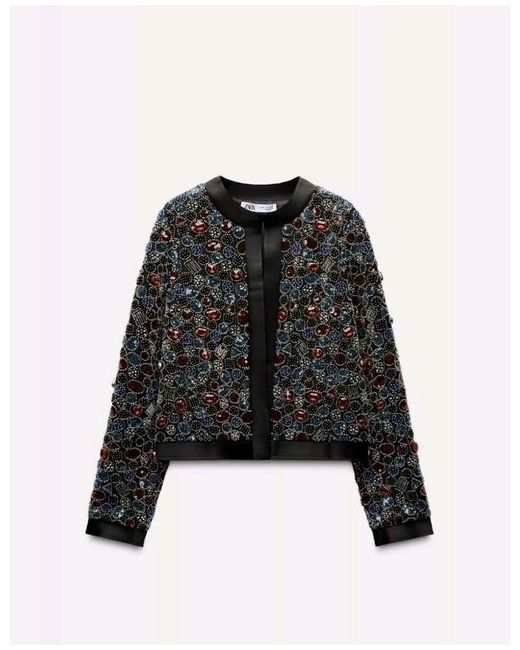 ZARA BEADED JACKET. Round neck, long sleeve jacket. Decorated with bead and sequin appliqués. Concealed hook fastening. SIZE SMALL. 4% elastane. 96% polyester.