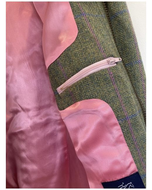 Ladies Equetech green tweed field jacket. Beautiful jacket with a pink satin type lining and brocade style edges. Green tweed with a pink and pale blue window pane over check. Pure new wool. Shoulder seam to cuff 23”.