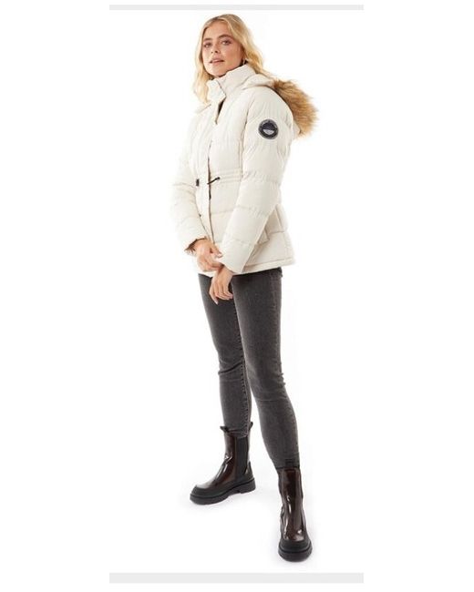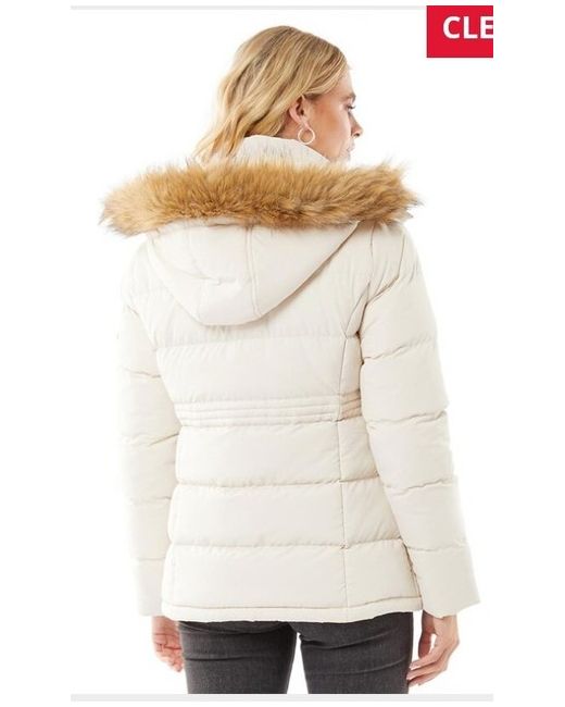 L'amore Couture lightweight puffer jacket with adjustable waist and faux fur hood trim. Grown-on hood. Two slip pockets. 100% polyester shell, lining and padding.
