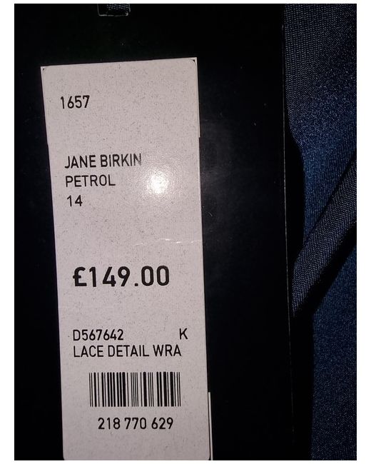 brand new never worn with tags attached. A Jane Birkin petrol dress with lace details on shoulders. Tag shown brought for £149