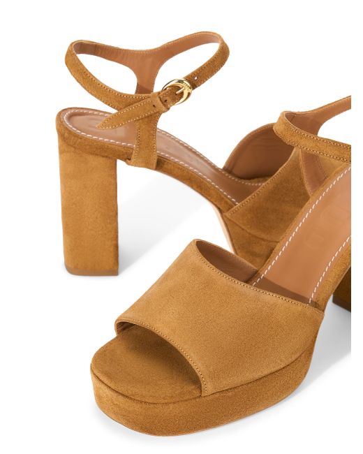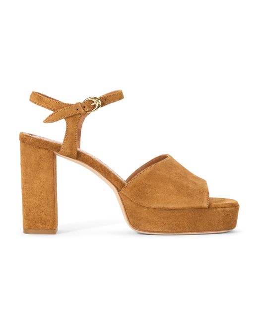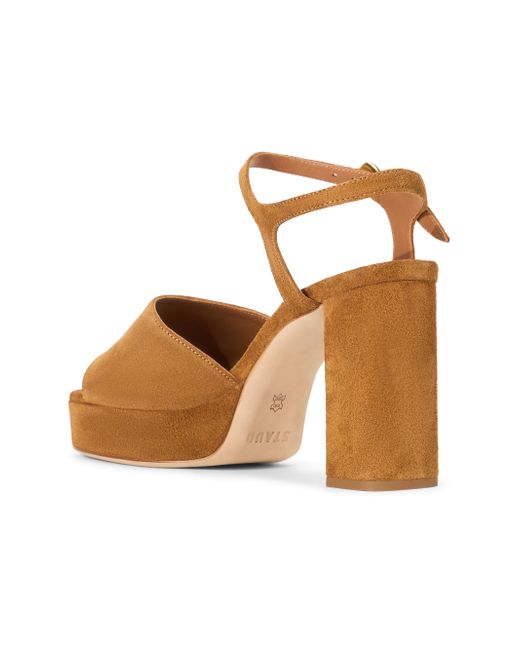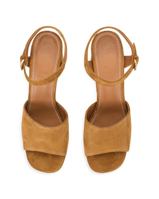 Staud's Jodie heels feature a sleek design crafted of suede. The platform height adds a bold touch to any ensemble. Open toe Buckle closure Suede upper Leather lining Leather sole Made in Portugal SIZE Platform: about 4" (100mm). Women's Shoes - Workshop Shoes > Staud > Saks Fifth Avenue > Barneys. Staud. Color: Tan. Size: 5.