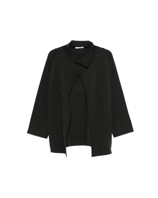 dark grey asymmetrical collar open front three-quarter sleeves straight hem