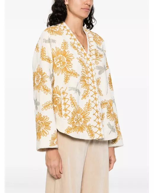 light beige concealed front fastening embroidered design V-neck long sleeves