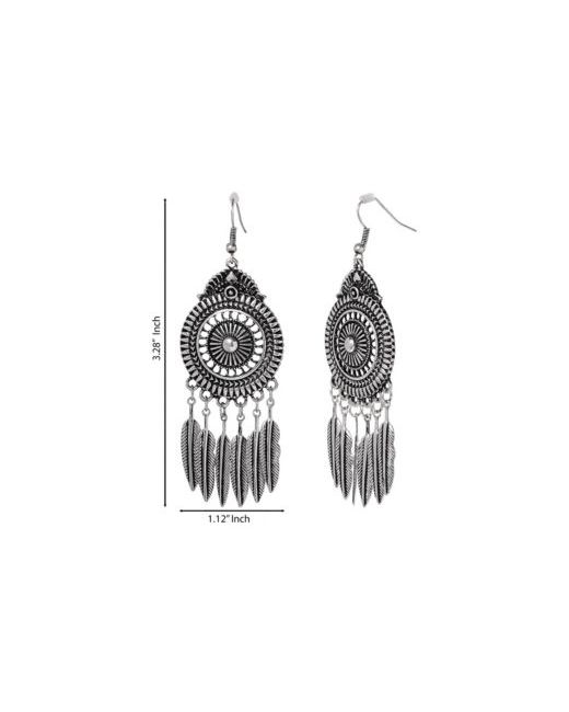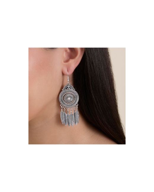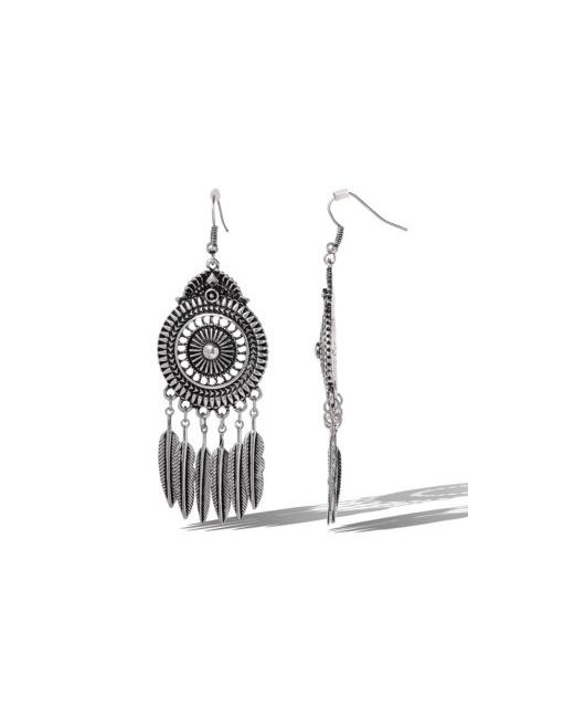 These statement feather drop earrings in antique silver from Jessica Simpson channel effortless boho vibes. The intricate detail adds vintage flair to any look.