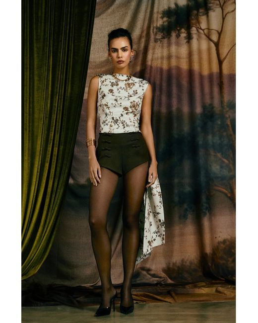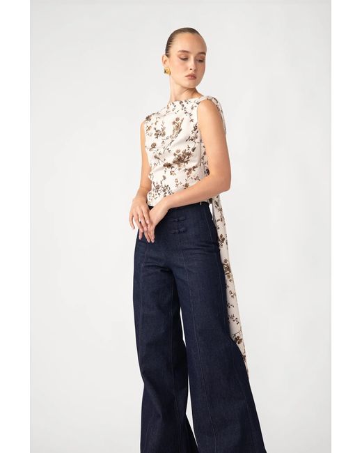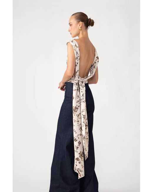 The Callie Top is crafted from milky crepe and features an open back that drapes elegantly with dramatic hand-sewn ties. The close fit and clean lines create a sleek shape, adding a nice contrast to the vintage cream floral print.