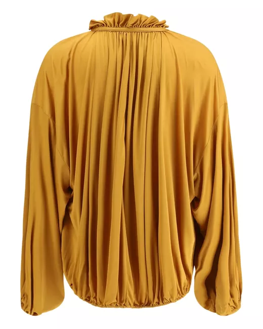 gold ruffled neckline drawstring hem long sleeves balloon sleeves keyhole neckline