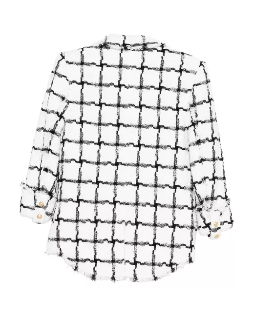 circa 2010s black grid pattern gold buttons frayed hem textured weave long sleeves Condition: EXCELLENT. This previously owned item is in near-perfect condition with no signs of damage or use.
