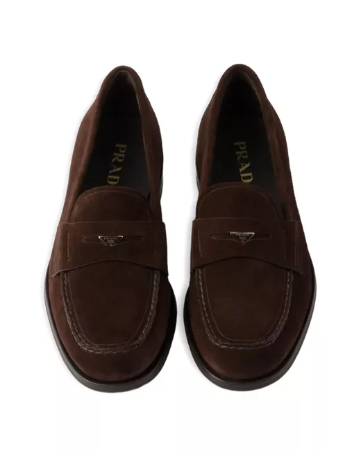 dark brown slip-on design penny slot triangle logo stacked heel rounded toe