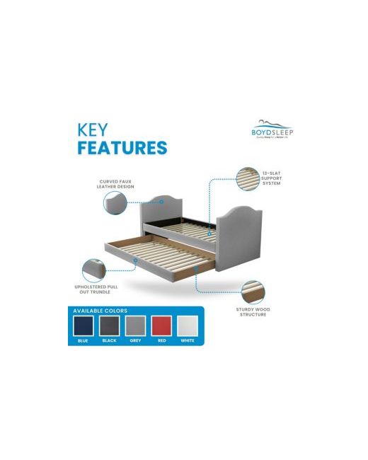 This daybed is fully upholstered and slightly padded to give it a premium look and feel. Its sofa back is tufted, hugged by sloping track arms with nailhead trim, providing a modern and elegant design. The trundle drawer of the daybed rolls out with ease, and when closed, it gives the appearance of a real sofa, with no visibility to the mattress and bedding inside.The trundle and bed area have supportive wood slats, providing a comfortable sleeping surface. Constructed of durable Mdf, the frame of this cute and functional daybed provides a reliable structure. You can use twin mattresses of your choice, and the trundle can hold a mattress up to 8 inches, giving you the flexibility to choose a deeper mattress on top, depending on your preference. The daybed ships in two boxes and comes complete with all the necessary hardware and instructions to assemble it quickly and easily.