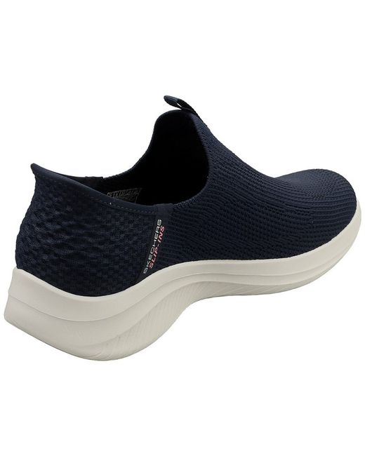 These Skechers SLIP-INS ULTRA FLEX 3.0 VEGAN trainers in navy are the epitome of effortless style and comfort. Crafted from a soft textile upper and lined with breathable textile for a cozy feel, these slip-on shoes feature a cushioned textile insole that cradles your feet with every step. The durable rubber sole provides excellent grip and traction, making them perfect for everyday wear. Slip them on and enjoy the freedom of movement and the confidence of knowing you're wearing stylishly sustainable footwear.