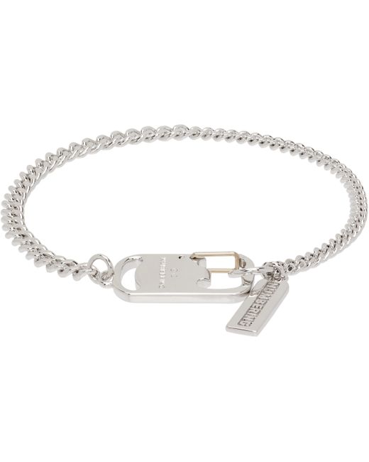 Curb chain bracelet in rhodium-plated brass. Logo plaque at graphic lanyard-clasp fastening. Supplier color: Silver