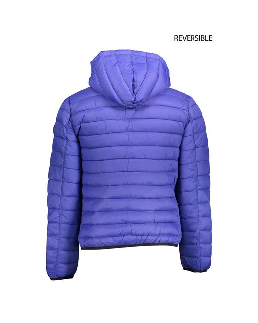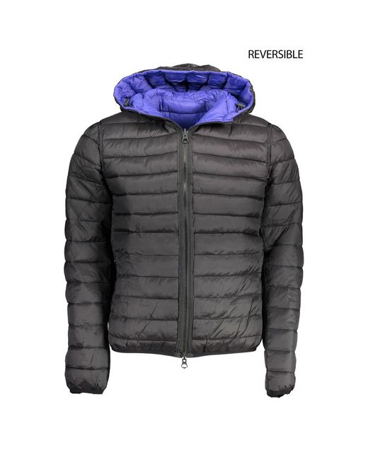 reversible jacket, blue-black, 2 external pockets, 2 internal pockets, zip, application, logo